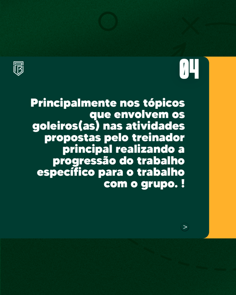 1- Participação ativa na elaboração do treinamento semanal da equipe. Principalmente nos tópicos que envolvem os goleiros(as) nas atividades propostas pelo treinador principal realizando a progressão do trabalho específico para o trabalho com o grupo.