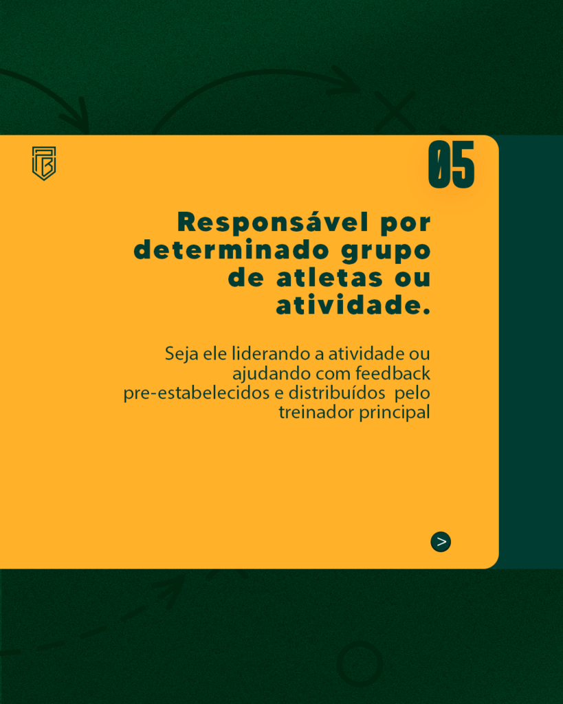2- Responsável por determinado grupo de atletas ou atividade. Seja ele liderando a atividade ou ajudando com feedback pre-estabelecidos e distribuídos pelo treinador principal.