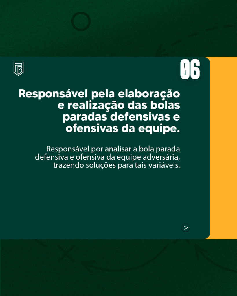 4- Responsável por analisar a bola parada defensiva e ofensiva da equipe adversária, trazendo soluções para tais variáveis.