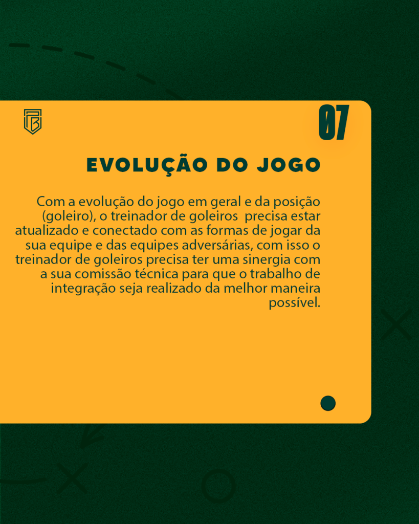 Com a evolução do jogo em geral e da posição (goleiro), o treinador de goleiros precisa estar atualizado e conectado com as formas de jogar da sua equipe e das equipes adversárias, com isso o treinador de goleiros precisa ter uma sinergia com a sua comissão técnica para que o trabalho de integração seja realizado da melhor maneira possível.