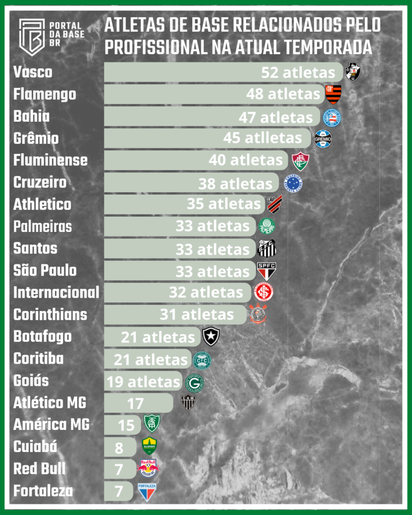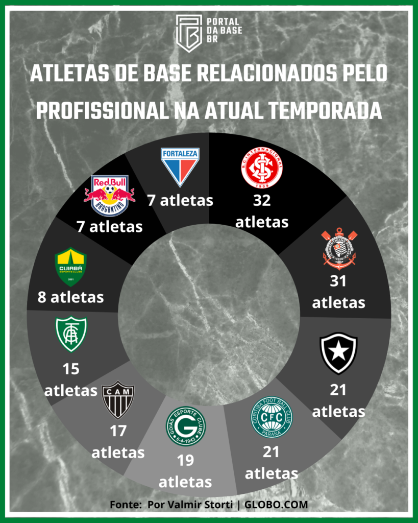 No dia 27 de fevereiro postamos aqui no Portal da Base Brasil, gráfico sobre a utilização de atletas de base no elenco atual do Profissional das 20 equipes da série A do Brasileiro.