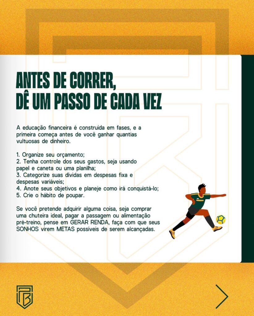 Se você pretende adquirir alguma coisa, seja comprar uma chuteira ideal, pagar a passagem ou alimentação pré-treino, pense em GERAR RENDA, faça com que seus SONHOS virem METAS possíveis de serem alcançadas.