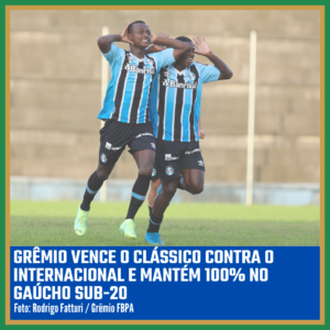 Em partida disputada na tarde desta quarta-feira (24/05), o GRÊMIO venceu o INTERNACIONAL por 1 a 0, válido pela 4ª rodada do Campeonato Gaúcho Sub-20, na Arena Cruzeiro, em Cachoeirinha/RS.