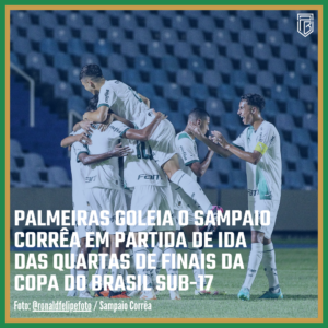 Em partida disputada da noite desta terça-feira (09/05), o PALMEIRAS goleou o SAMPAIO CORRÊA por 12 a 0, confronto de ida das quartas de finais da Copa do Brasil Sub-17, no Castelão, em São Luís/MA