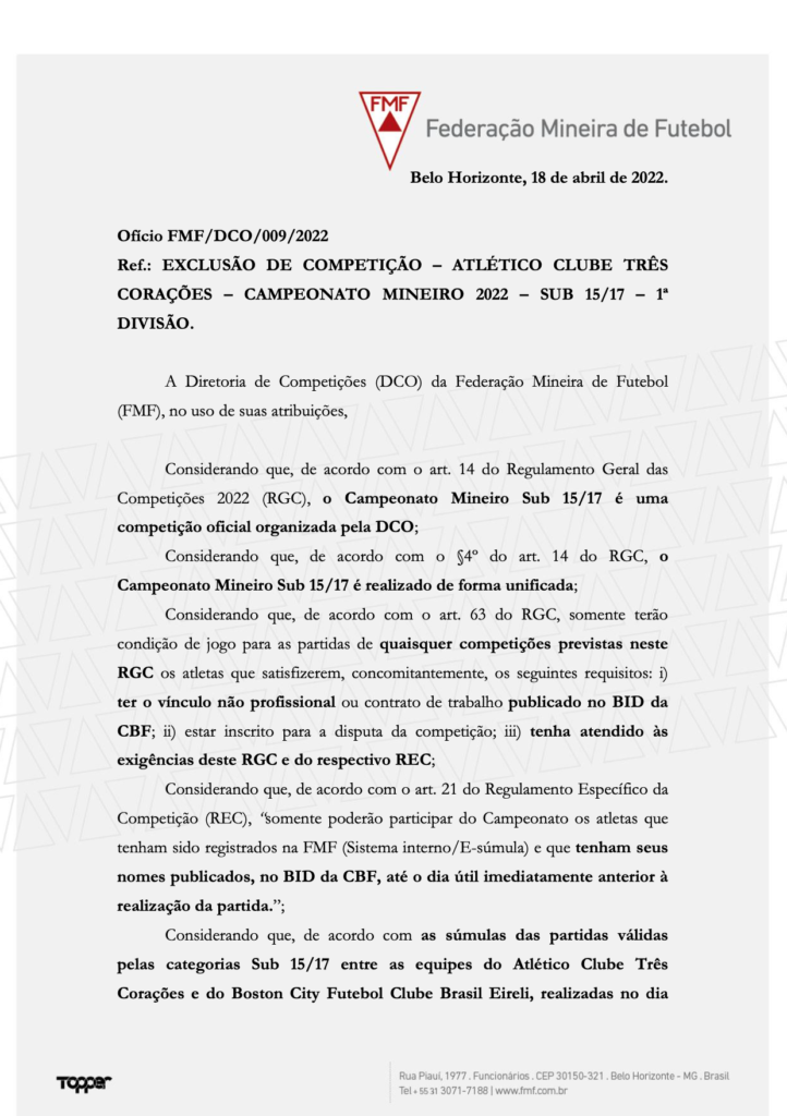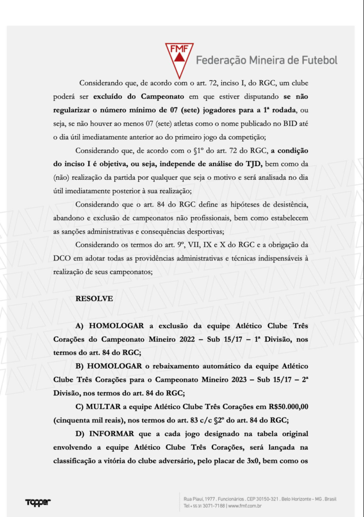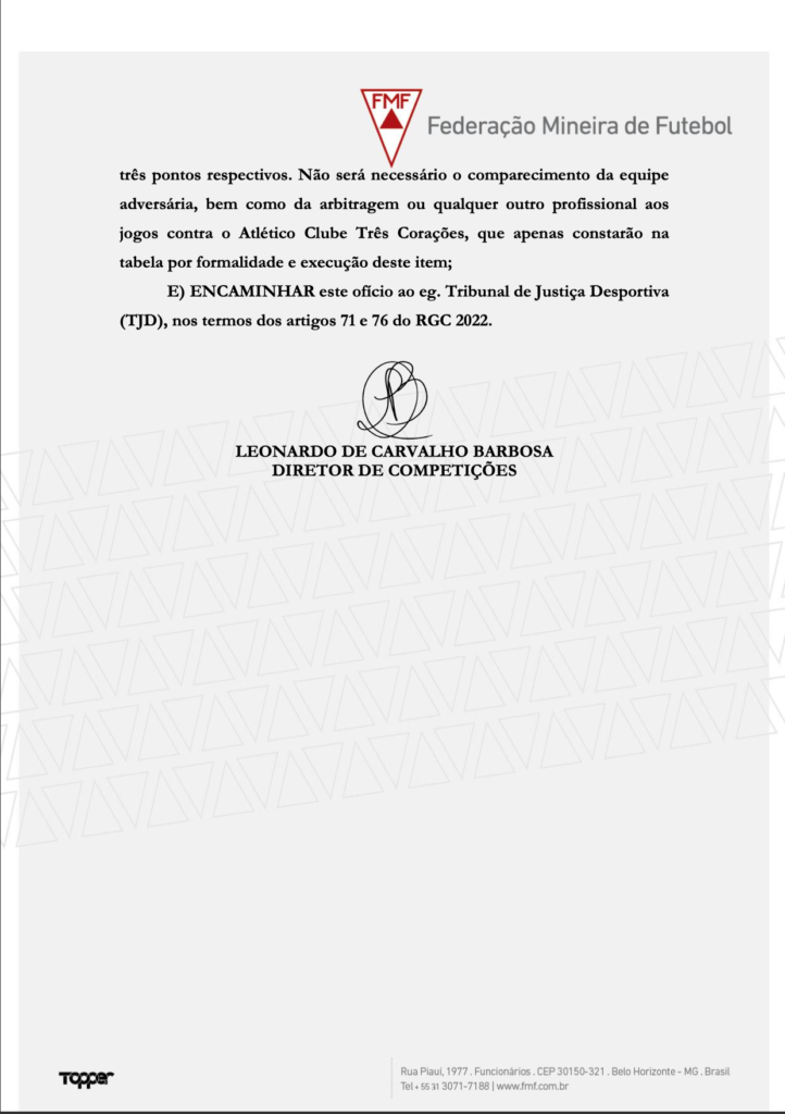 Confira a íntegra do ofício publicado pela Federação Mineira de Futebol.