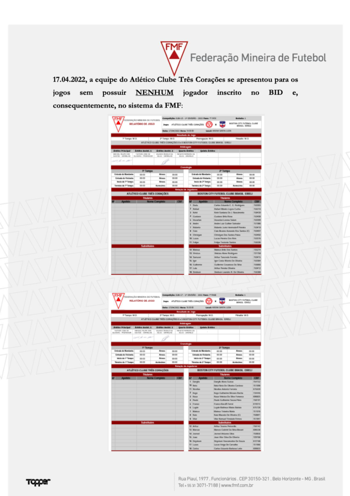 “Fizemos um ofício bem fundamentado e com todos os dispositivos e artigos do regulamento. Basicamente, o Atlético de Três Corações não tinha nenhum atleta inscrito nas categorias Sub-15 ou Sub-17. O RGC aponta que a equipe tem que ter no mínimo sete atletas inscritos na primeira rodada da competição. Assim, não tivemos outra alternativa que não fosse o rebaixamento e aplicação de multa à equipe”, destacou Leonardo Barbosa, Diretor de Competições da FMF, em contato com o Portal da Base.
