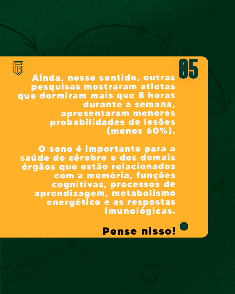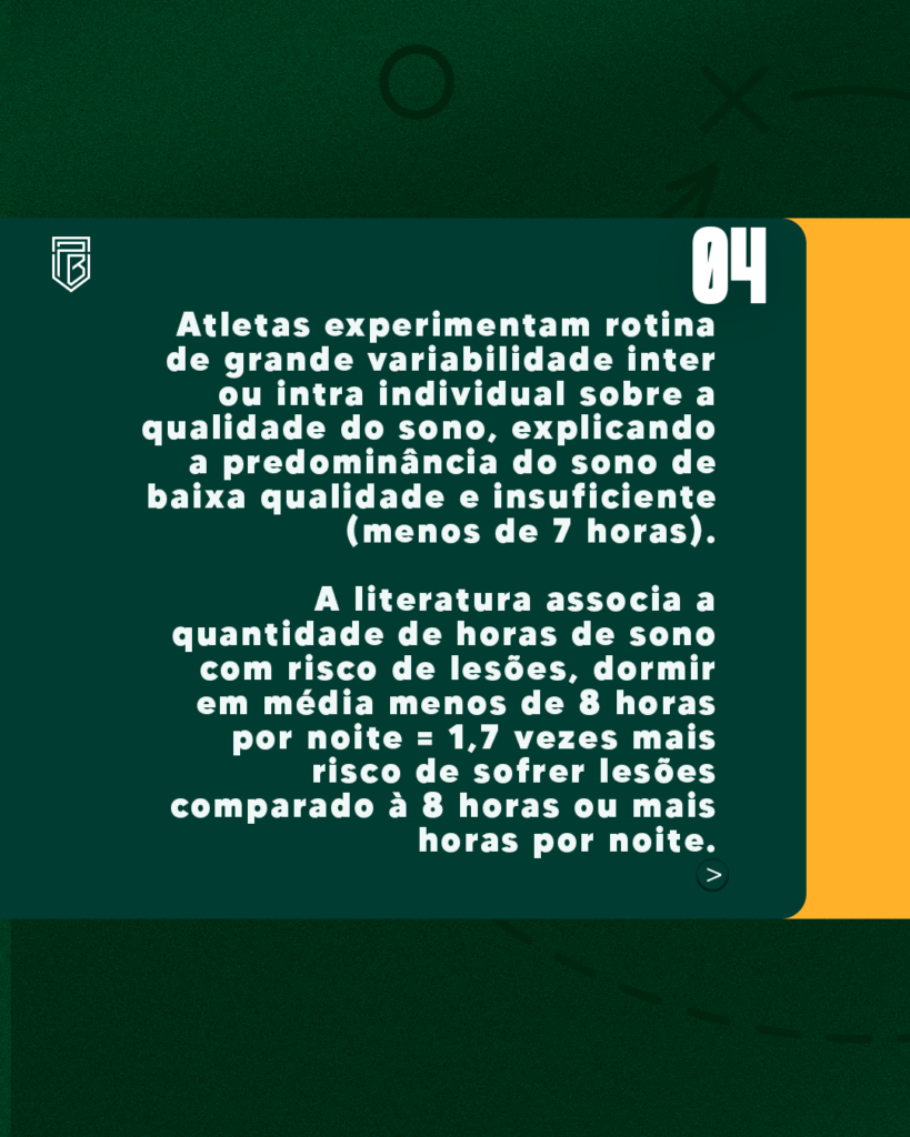 Além disso, a literatura associa a quantidade de horas de sono com risco de lesões (dormir em média < 8 horas por noite = 1,7 vezes mais risco de sofrer lesões comparado à 8 horas ou mais horas por noite). Ainda, nesse sentido, outras pesquisas mostraram atletas que dormiram > 8 horas durante a semana, apresentaram menores probabilidades de lesões (< 60%).