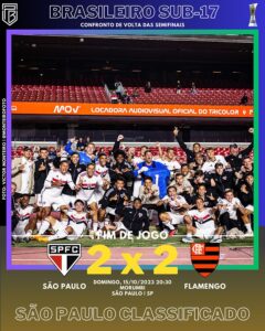 Em partida disputada na noite deste domingo (15/10), SÃO PAULO e FLAMENGO empataram em 2 a 2, confronto de volta das semifinais do Campeonato Brasileiro Sub-17, no Estádio Morumbi, em São Paulo/SP.