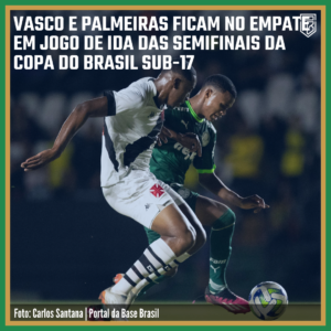 Em partida disputada na noite desta terça-feira (30/05), VASCO e PALMEIRAS empataram em 1 a 1, confronto de ida das semifinais da Copa do Brasil Sub-17, em São Januário, no Rio de Janeiro/RJ.